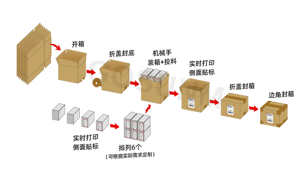 ◆ 步:產品彩盒貼標,機械手裝箱投料