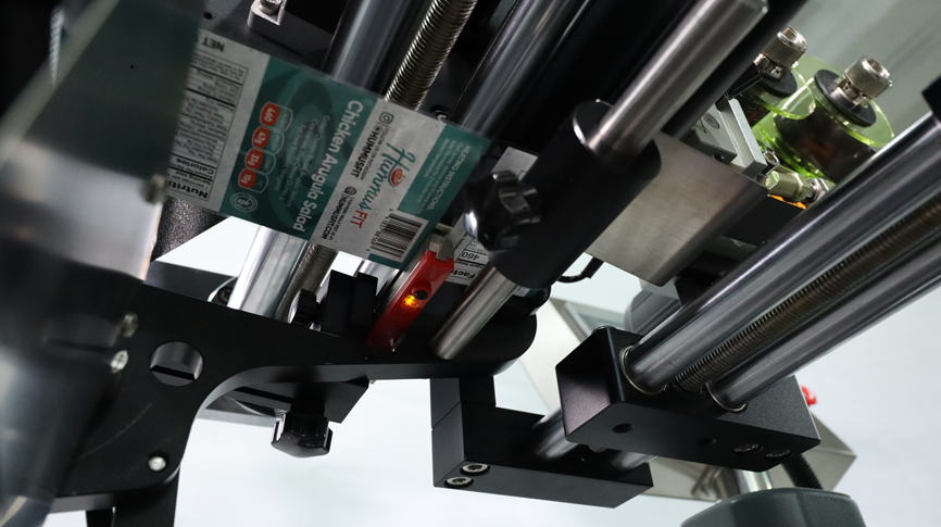 產品由輸送機構被精確傳送到貼標工位。此時,一個關鍵的傳感器(通常為光纖或超聲波)會實時探測產品的位置。一旦產品到達預設的精確點位,該傳感器會瞬間發出一個電信號,指令貼標頭立即啟動工作。這是整個過程的“發令槍”,確保了動作的起點精準。