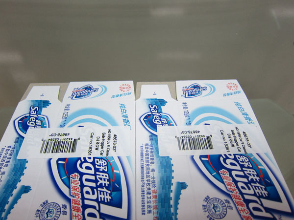 下圖是我公司類卡片實時打印貼標機對舒膚佳包裝盒進行平面貼標的樣品圖片。