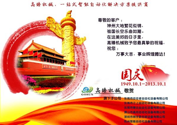 國慶節來臨之際,東莞市高臻智能自動化設備有限公司祝大家假期愉快。