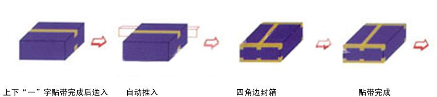 ◆ 上下“一”字貼帶完成后送入—自動(dòng)推入?四角邊封箱?貼帶完成